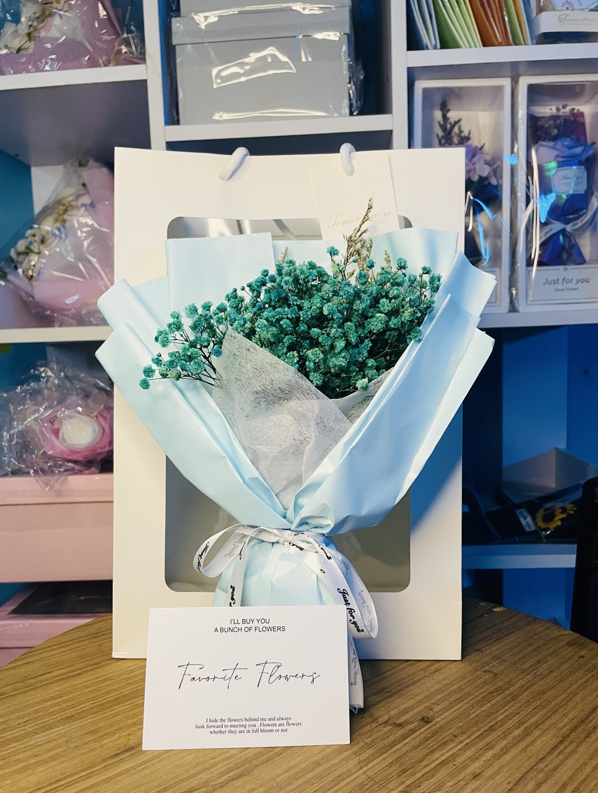 | Dried Baby’s Breath Bouquet | Yes | A large bouquet of light blue dried baby’s breath (Gypsophila). |