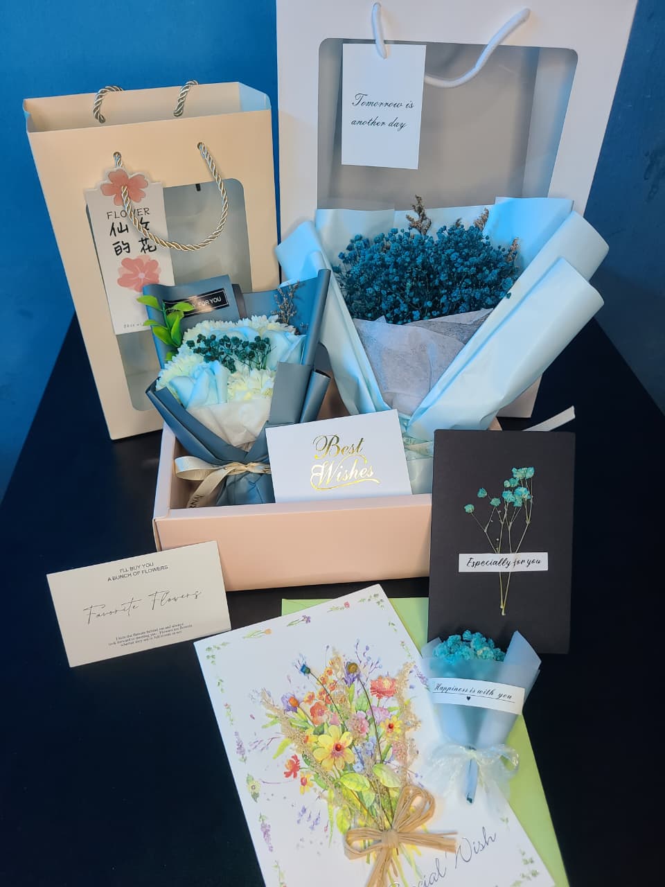 This exquisite Blue Combo Flowers Set is a serene and sophisticated gift package, combining long-lasting soap flowers with trendy dried florals and thoughtful stationery. Dominated by shades of blue and white, this collection symbolizes trust, loyalty, and tranquility, making it an ideal choice for congratulations, best wishes, or thank-you gifts.