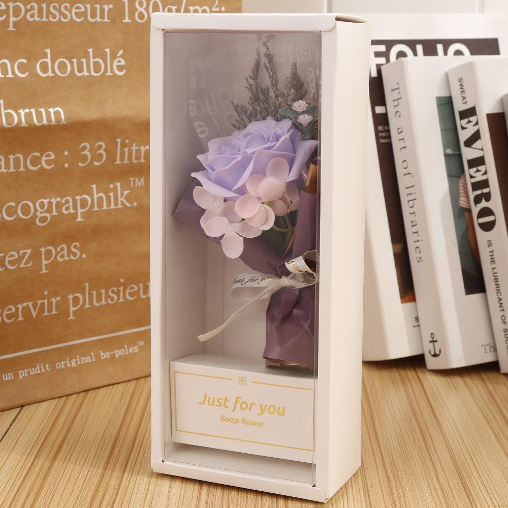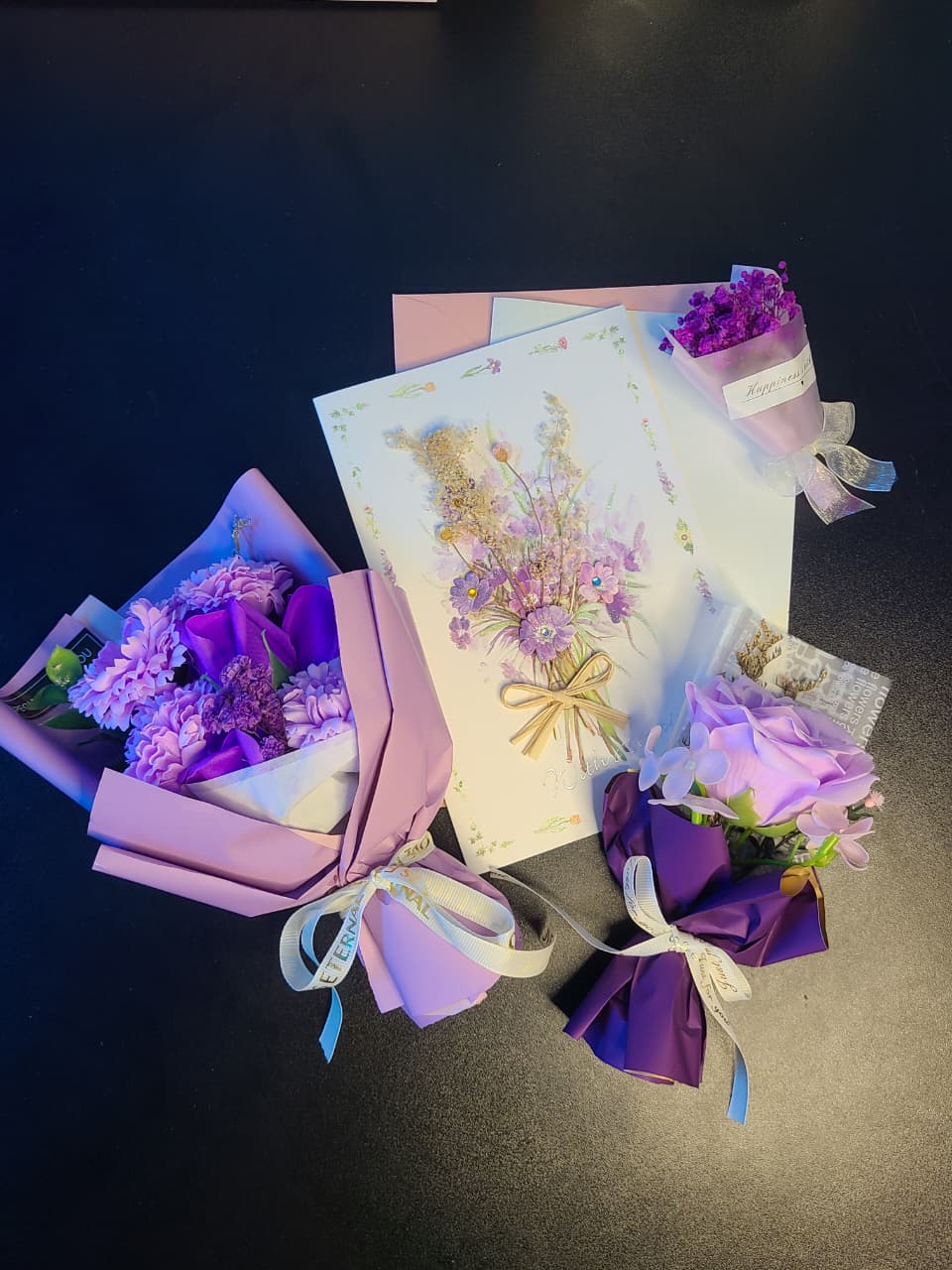 | 1. | Premium Soap Roses Bouquet | The largest bouquet on the left, featuring multiple small, deep purple/lavender flowers (likely soap flowers), wrapped in coordinating purple and lavender paper with an “ETERNAL” ribbon. |