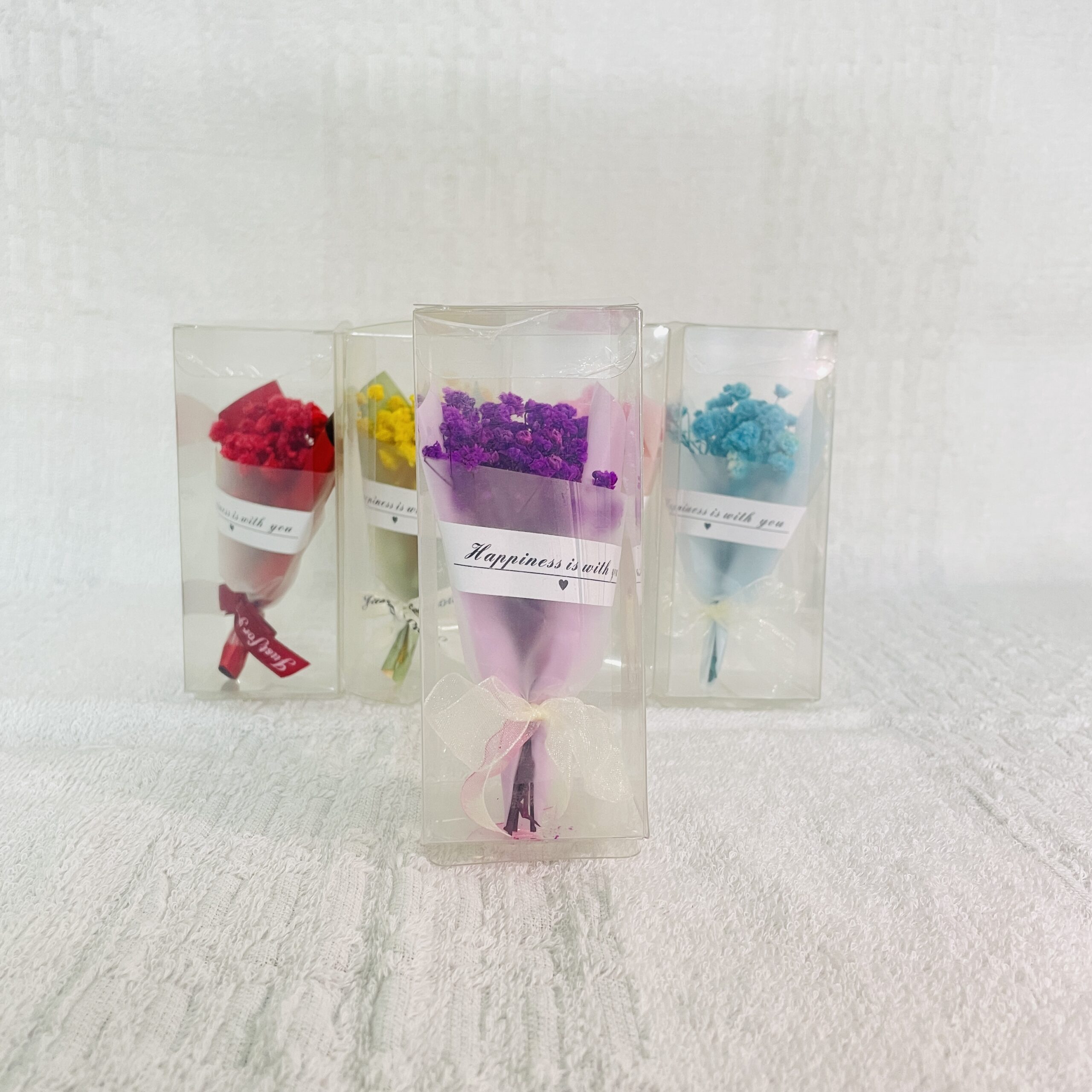 | 4. | Mini Dried Flower Bouquet | The tiny cluster of small, delicate purple accent flowers (like baby’s breath) wrapped in sheer paper and labeled “Happiness.” |